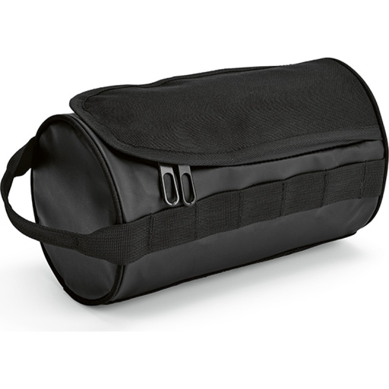Riga barrel shaped toiletry bag (5.7L) in recycled polyester 600D. The water resistant fabric protects the contents and the double sided zipper provides easy access through the U shaped pocket. Comes with hanging loop for added convenience and with a carry handle.