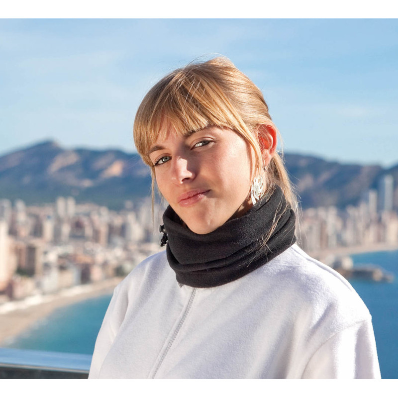 neck warmer in polar fleece 200g/m2 with anti-pilling treatment. In a wide range of bright tones, with string closure and adjustment accessory.