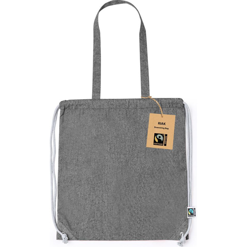 Fairtrade line drawstring backpack, made of cotton 140g/m2. Stitched finish, with natural colour cotton strings and reinforced with metal eyelets. Including carry handles. and available in a variety of colors. Recycled cotton label and resistance up to 8 kg in weight. With Fairtrade certification, an alternative to the conventional trade system that pursues the development of peoples and the fight against poverty.