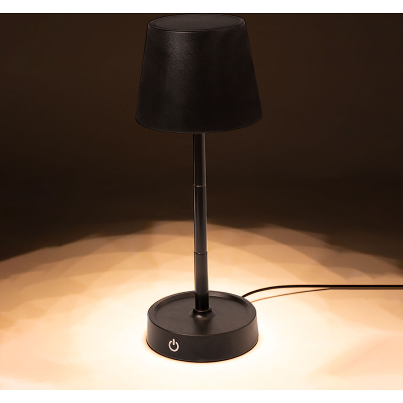 Lamp with a design in matte black finish. Includes a touch dimmer system and a foldable body to adjust height. Equipped with a rechargeable 800mAh battery via USB Type C -cable included- and 12 warm light LEDs. With an on/off button on the back.
