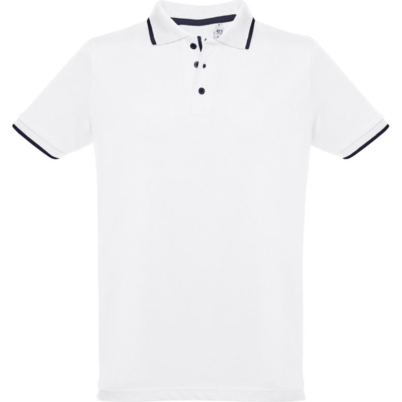 Short-sleeved bicolour polo for men in 100% carded cotton pique (210 g/m²). Two-colour contrast on the collar, sleeve and placket. Contains collar and cuffs in Rib. Reinforced placket with 3 contrasting colour buttons (extra button inserted in the inner side seam). Fitted waist and small side slits on the bottom of the polo. Sizes: S, M, L, XL, XXL