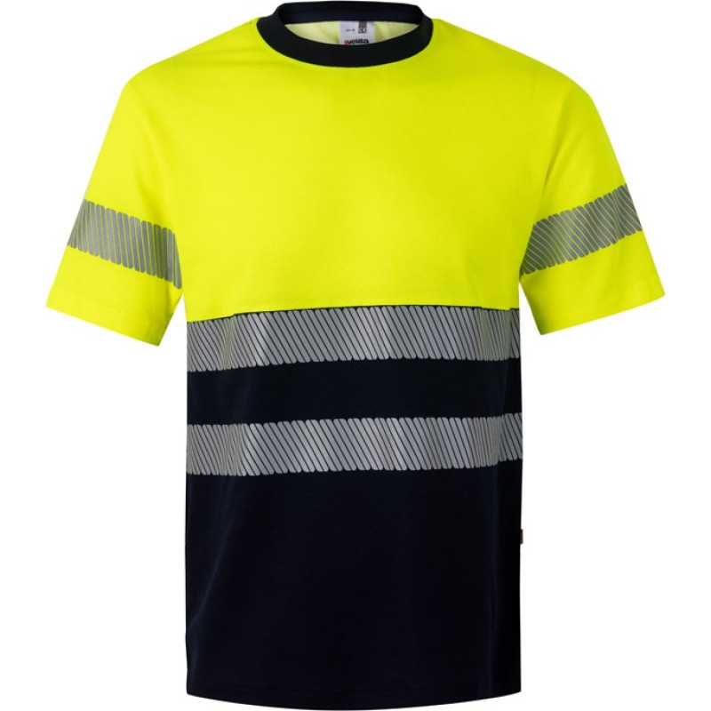 Two-tone piqué T-shirt (150g/m²), in cotton (55%) and polyester (45%). Short sleeves, with ribbed round collar in contrasting color, segmented reflective stripes on the torso and sleeves. Product in compliance with EU Reg. 2016/425, certified by EN20471 and class Nº 1. Size: S, M, L, XL, 2XL, 3XL