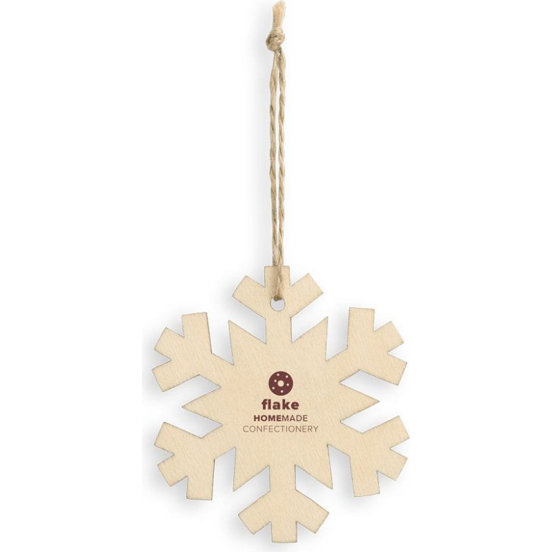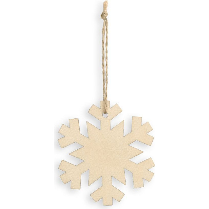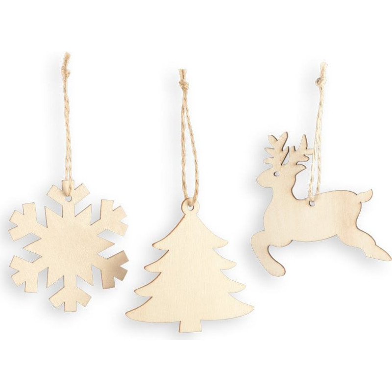 Set of 3 plywood Christmas ornaments with different designs. As the product is made from natural materials, the colour and the printing result may vary between products. sob 85x80x2.3 mm, sněhová vločka ø78x2.3 mm, vánoční strom 80x79x2.3 mm